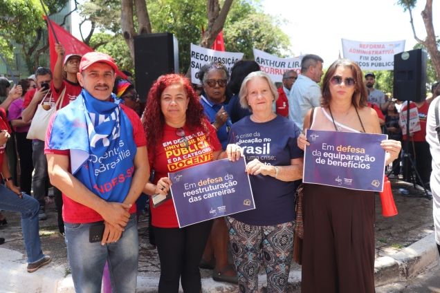 A docente Patrícia Pinheiro, do Departamento de Serviço Social também participou do ato em defesa do serviço público de qualidade. “Precisamos, juntos, lutar para garantir que a população tenha, principalmente, acesso e permanência à educação pública. É um direito constitucional garantido. Precisamos lutar para que não haja precarização das políticas públicas de Estado, para que haja ampliação de direitos”, disse.