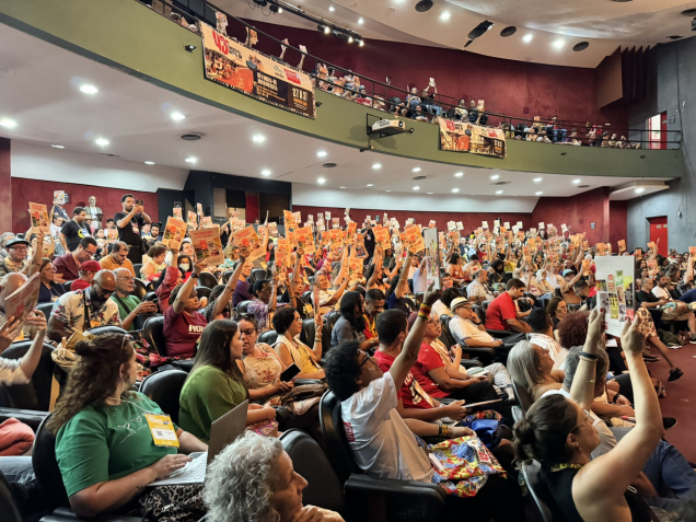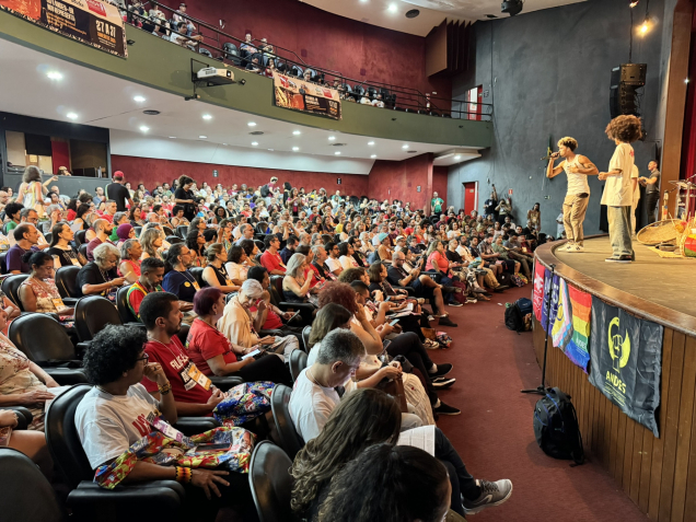 A primeira plenária de debates do congresso, discutiu ‘Conjuntura e Movimento Docentes’, a partir de oito textos com formulações sobre o tema que foram disponibilizados no Caderno de Debates do Congresso. Os debates abordaram aspectos da conjuntura nacional e internacional e suas implicações no movimento docente, como avanço da extrema direita, carreira, governo federal, genocídio do povo palestino, eleição nos Estados Unidos, entre outros temas.