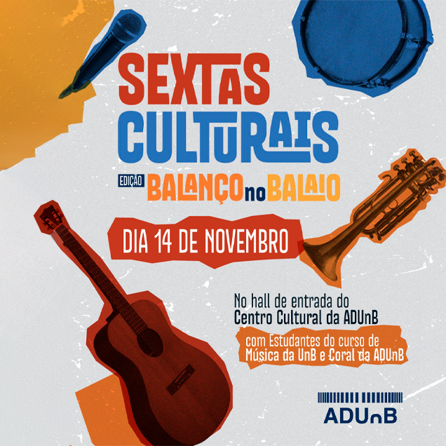 A programação do projeto retorna no dia 14 de novembro, a partir das 19h, no hall de entrada do Centro Cultural do sindicato. Nesta edição, intitulada “Balanço no Balaio”, os protagonistas serão os estudantes da terceira idade do curso de Música da Universidade de Brasília (UnB), que prometem encantar o público com talento e entusiasmo. A atividade é realizada pelo Grupo de Trabalho de Comunicação, Cultura e Arte da ADUnB.