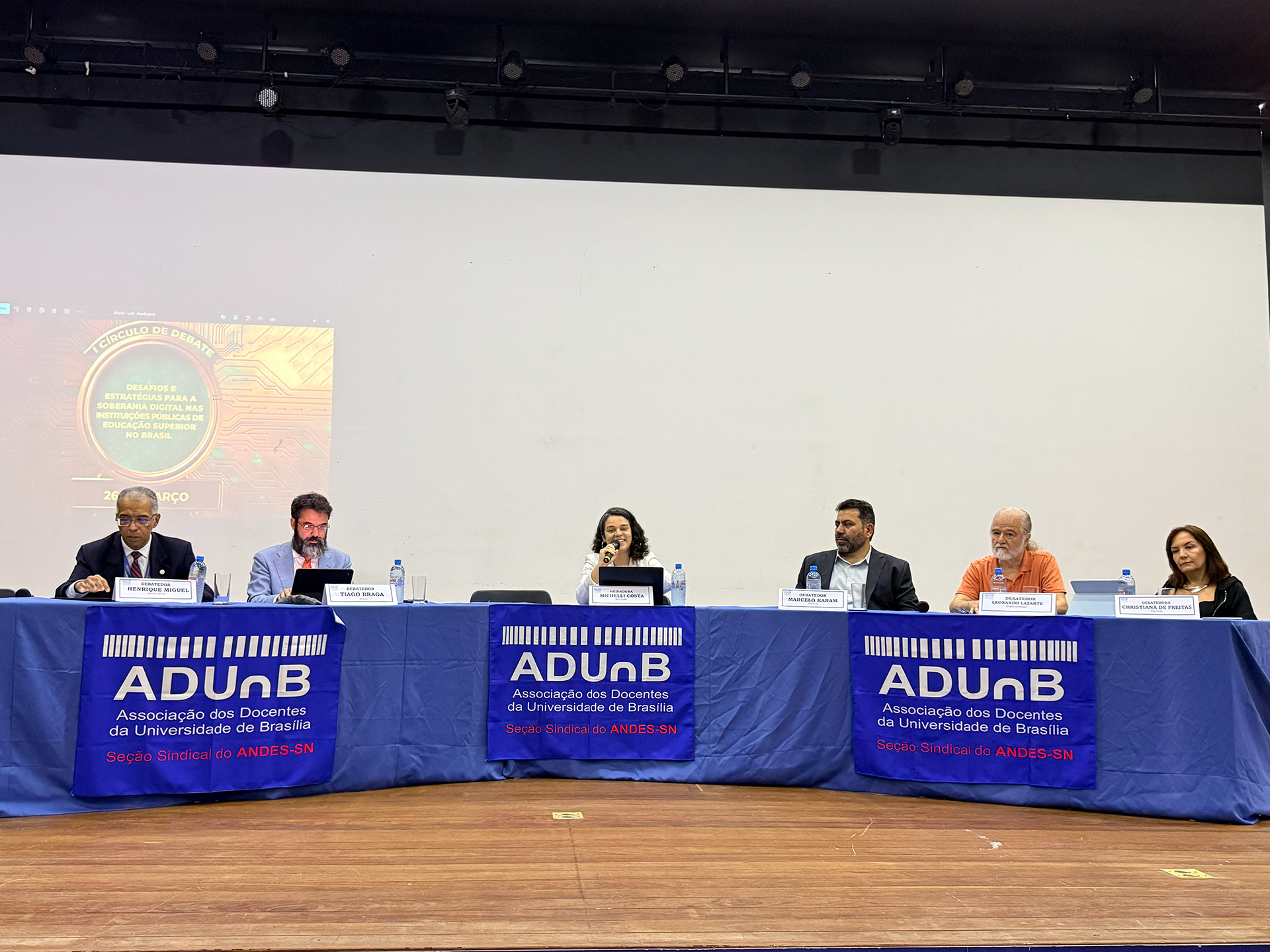 Em meio aos crescentes desafios impostos pela dependência tecnológica, o 1º Círculo de Debate “Desafios e estratégias para a soberania digital nas instituições públicas de educação superior no Brasil” foi realizado nesta quinta-feira (26), no auditório da ADUnB. Organizado pelo Grupo de Trabalho de Ciência e Tecnologia do sindicato (GTCT), o encontro reuniu especialistas, gestores e a comunidade acadêmica para refletir sobre o domínio das big techs, bem como a urgência de construir autonomia nacional na infraestrutura digital e informacional.